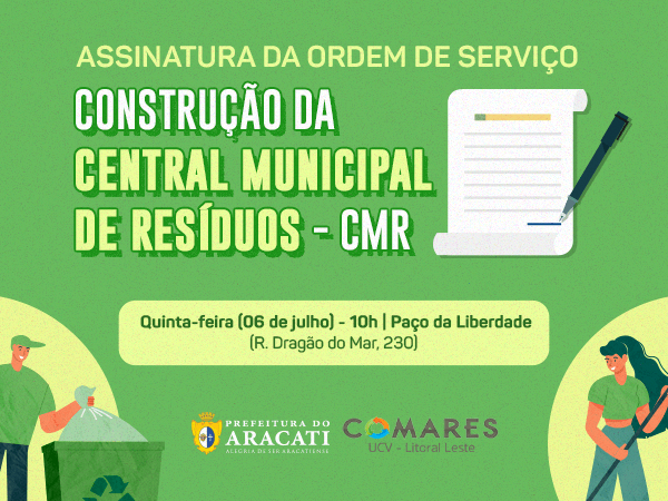 Como forma de acelerar o fechamento do lixão e gerar renda com reciclagem, a cidade de Aracati ganhará uma Central Municipal para tratamento de resíduos. A assinatura da ordem de serviço da unidade acontecerá nesta quinta-feira, 6, a partir das 10h, no anexo do Paço Municipal da Liberdade (Rua Dragão do Mar, 230).