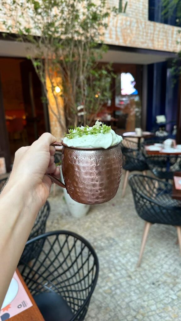 Receita: vodca, xarope de gengibre, sumo de limão, água com gás e espuma de salsão. O drink é montado em uma caneca de cobre.