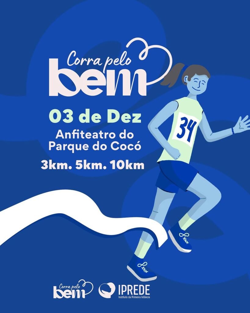 O Instituto Primeira Infância (Iprede) informa a nova data da primeira edição de sua corrida de rua, intitulada “Corra pelo Bem”. Com o objetivo de garantir uma experiência inesquecível para todos os atletas, a prova será realizada no dia 3 de dezembro, às 6h, com local de largada e chegada no Anfiteatro do Parque do Cocó. A decisão segue orientações técnicas de acordo com o apoio do Ministério do Esporte
