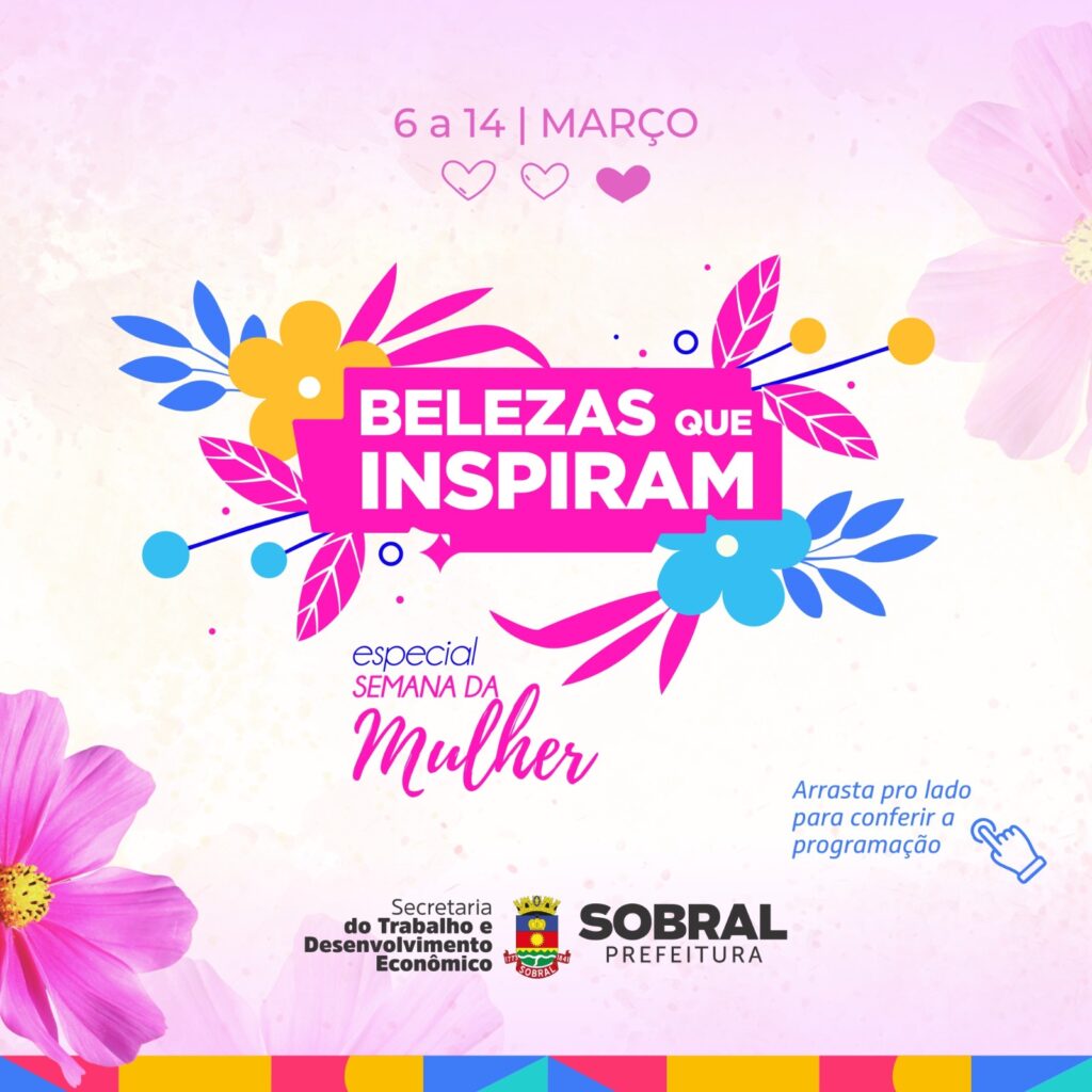 Tendo como objetivo qualificar profissionalmente e valorizar a mulher, a Prefeitura de Sobral, por meio da Secretaria do Trabalho e Desenvolvimento Econômico (STDE), em parceria com a Secretaria de Planejamento e Gestão (Seplag), realizará dos dias 6 a 14 de março, a II Semana do Dia Internacional da Mulher, que tem como título deste ano “Belezas que inspiram”.