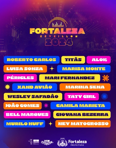 Roberto Carlos, Ney Matogrosso, Titãs, Marisa Monte, Alok, Péricles, Luísa Sonza, Marina Sena, João Gomes, Wesley Safadão, Xand Avião, Mari Fernandez, Taty Girl, Bell Marques, Camila Marieta, Murilo Huff e Giovana Bezerra são as atrações confirmadas para os três dias da festa da virada, que promete ser a maior da história da capital cearense.