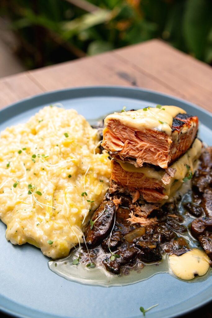 – Salmão cogumelo – 200g de salmão grelhado na brasa, acompanhado por um mix de cogumelos, molho bernese e risoto de mandioquinha – R$ 90;