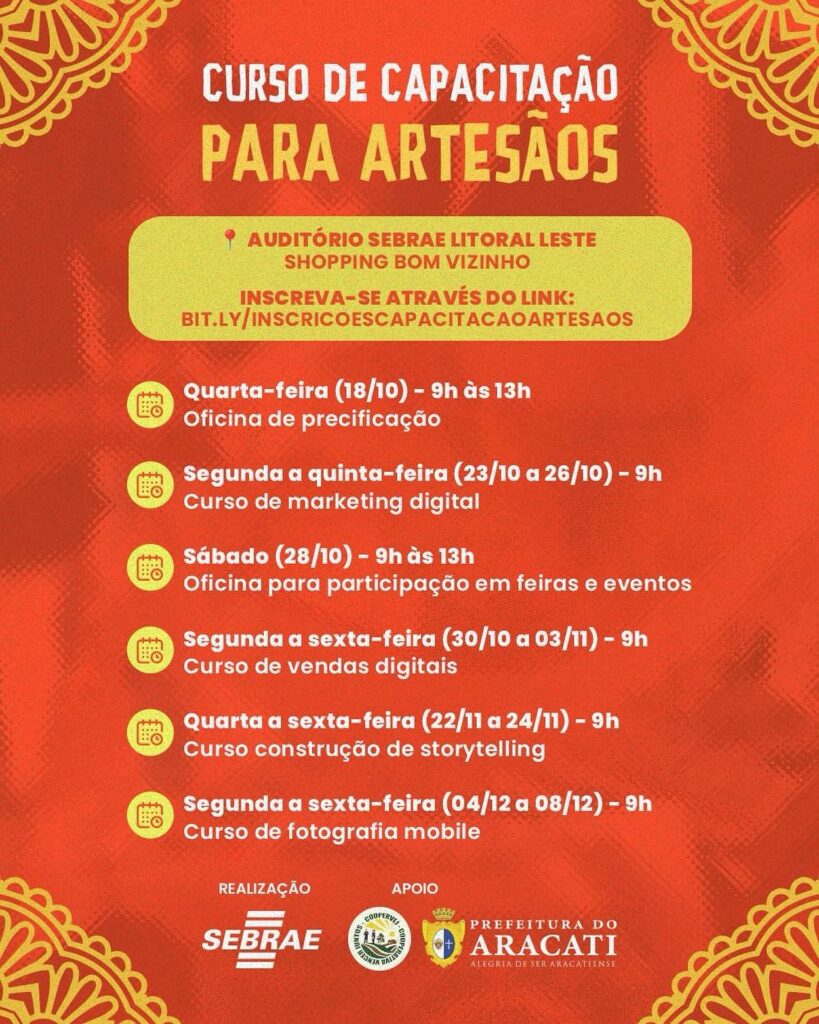 O Sebrae, com o apoio da Prefeitura do Aracati e da Cooperativa Vencer Juntos – COOPERVEJ, preparou uma programação de cursos direcionados aos artesãos locais. Estão sendo oferecidos seis cursos diferentes do período de outubro a dezembro. Todas as capacitações são ministradas no auditório do SEBRAE, localizado dentro do Shopping Bom Vizinho.